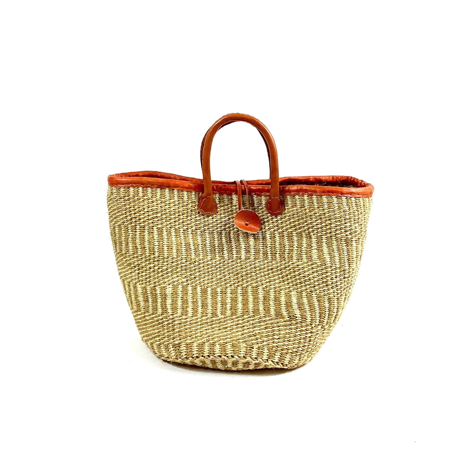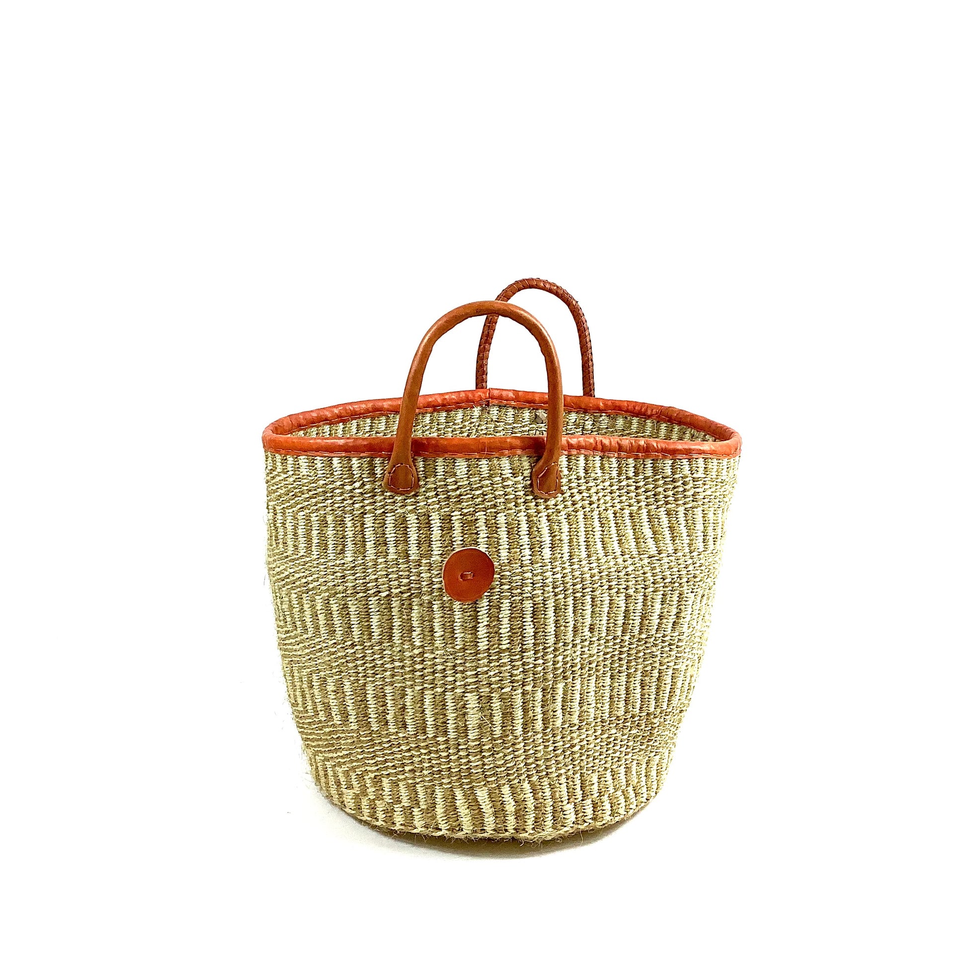 Handflätad av skickliga konsthantverkare från Akamba Womens group i Kenya, gör denna deskret mönstrade korg i naturfärger både vacker och säker att hålla i många år. Korgen är stängbar med en praktisk knapp, och dess läderhandtag ger inte bara en bekväm grepp punkt, utan bidrar också till den autentiska känslan och stilen. Den kan användas för att förvara tidningar, leksaker, hobby material eller som en vacker inredningsdetalj för den som strävar efter att skapa en fin och hemtrevlig atmosfär i sina rum.