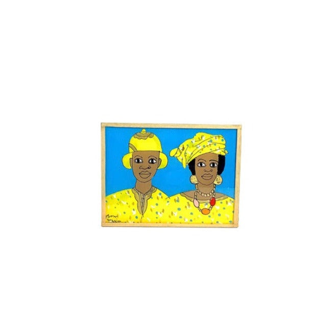 OM: Tavla föreställande en hustru och man. En sådan målning av ett par är vanligt som dekoration i afrikanska hem och symboliserar att huset tillhör ett gift par. Tavlan är målad direkt på glasets baksida med en teknik som kallas "African reverse glass painting". Alla bilder är unika.