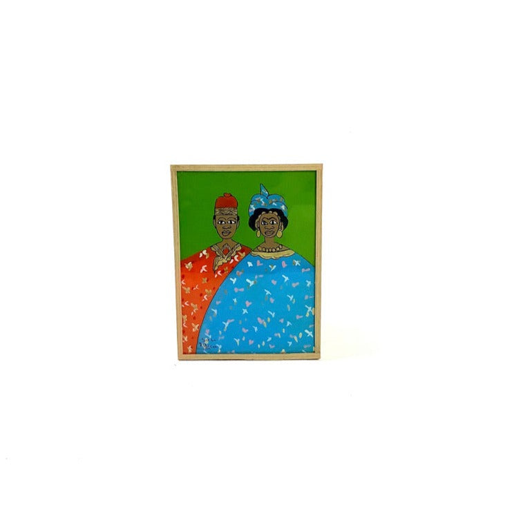 OM: Tavla föreställande en hustru och man. En sådan målning av ett par är vanligt som dekoration i afrikanska hem och symboliserar att huset tillhör ett gift par. Tavlan är målad direkt på glasets baksida med en teknik som kallas "African reverse glass painting". Alla bilder är unika.
