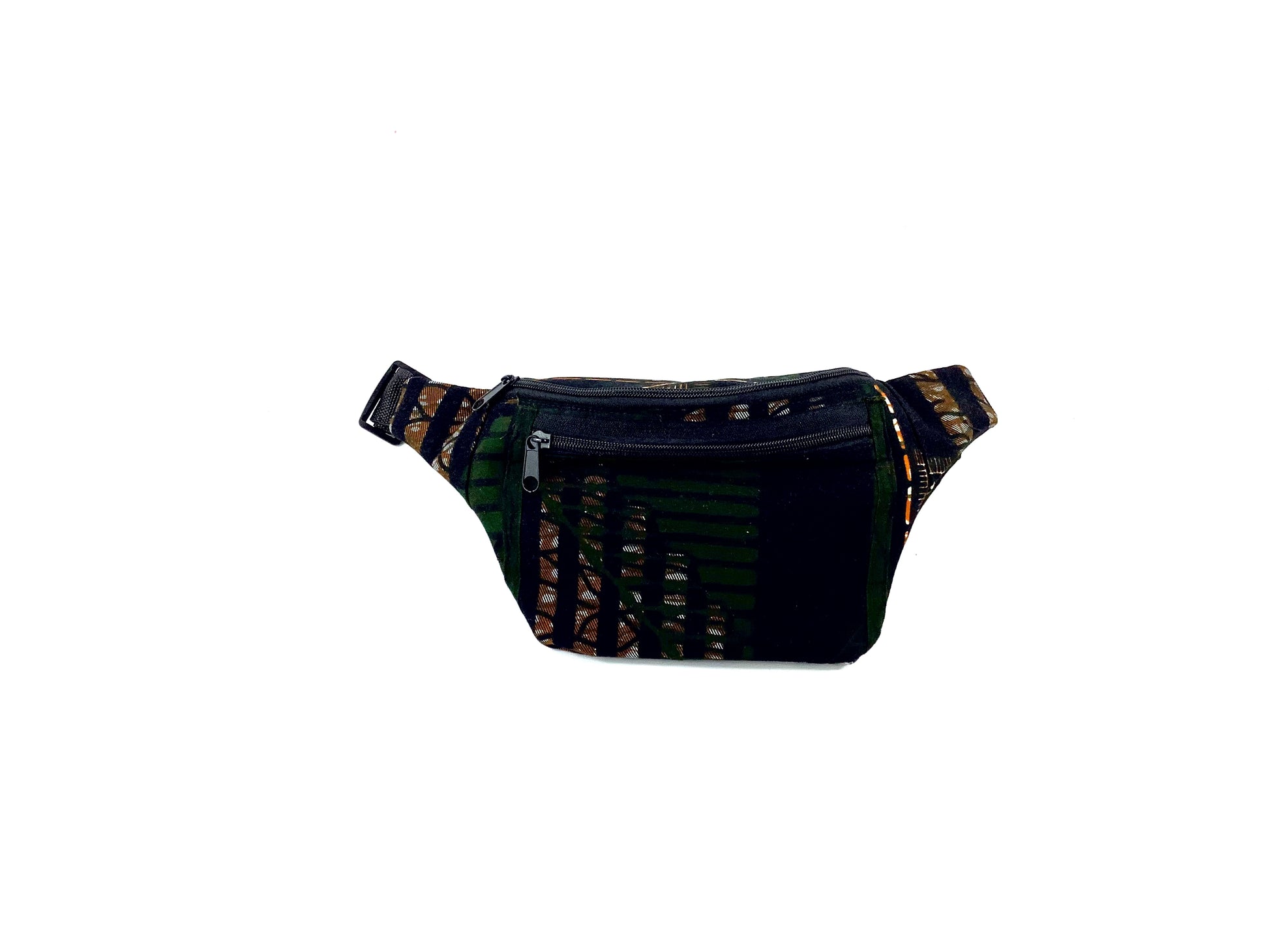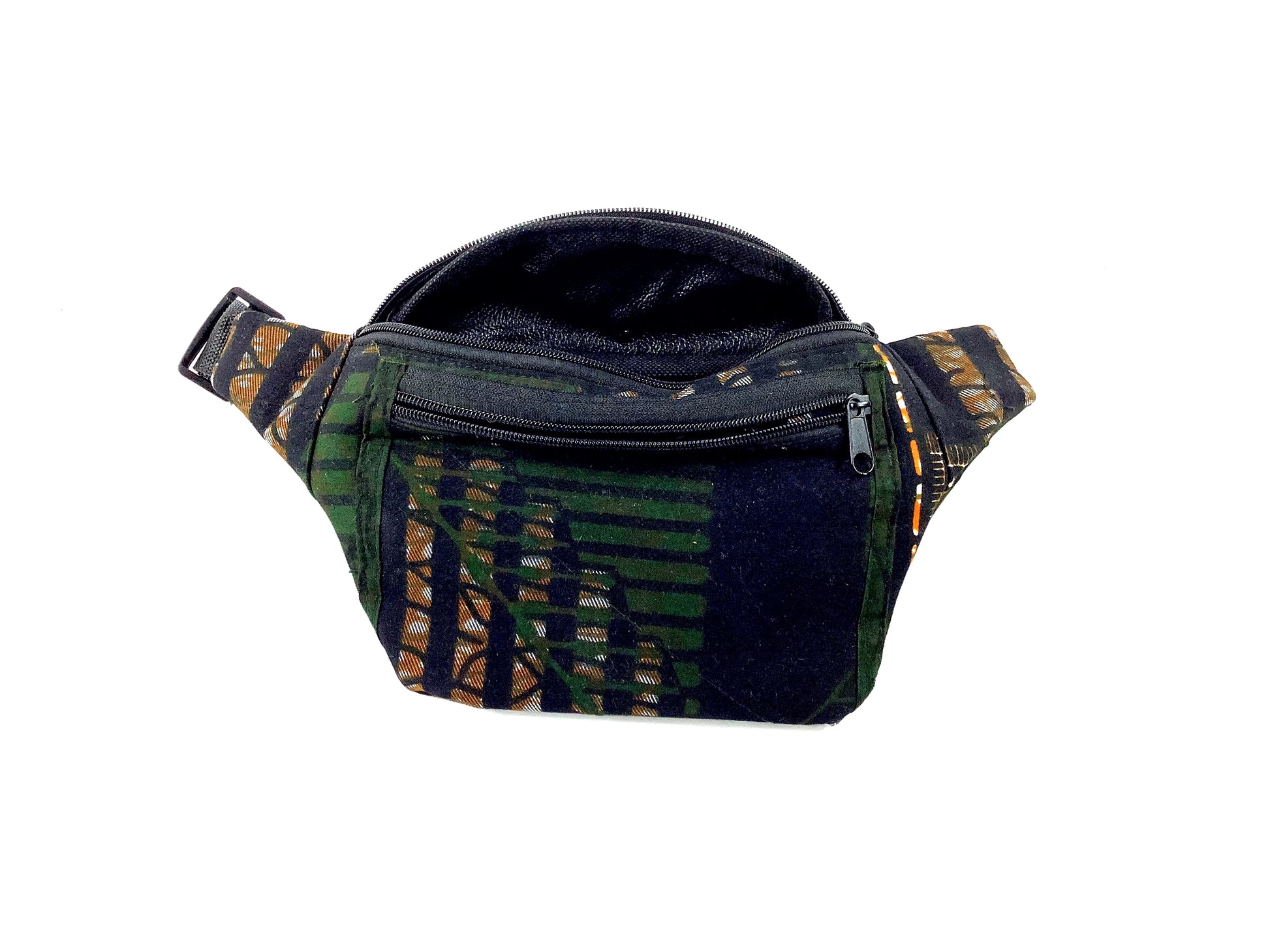 OM: Midjeväska tillverkad av 100% bomullstyg med vaxtryck från Ghana Textile Printing (GTP). Väskan har en lång svart midjerem.