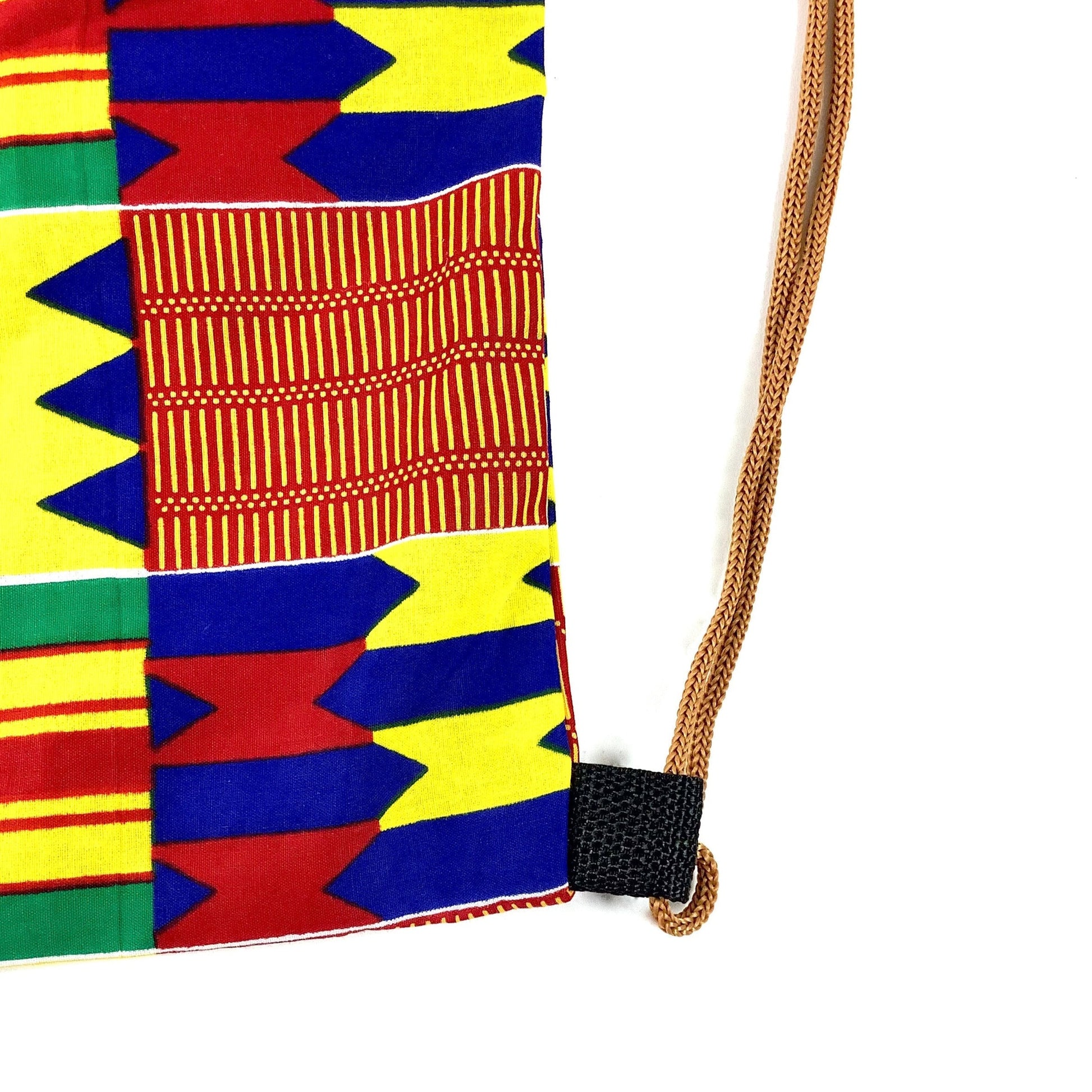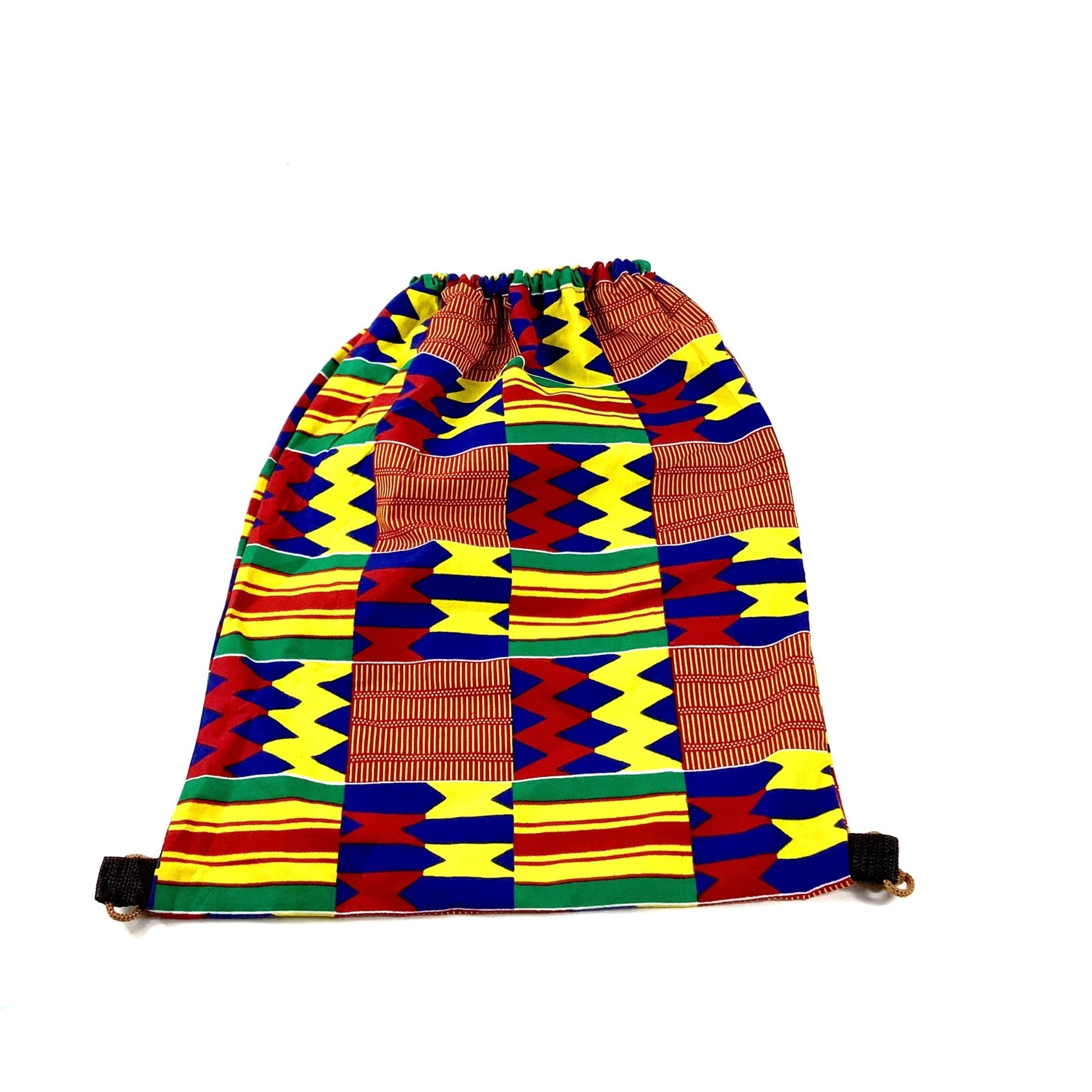 OM: Ryggsäck tillverkad av 100% bomullstyg med vaxtryck från Ghana Textile Printing (GTP). Ryggsäcken har matchande snoddar som axelband. Väskan är fodrad och har ett blixtlåsfack inuti. Perfekt till gympakläder!