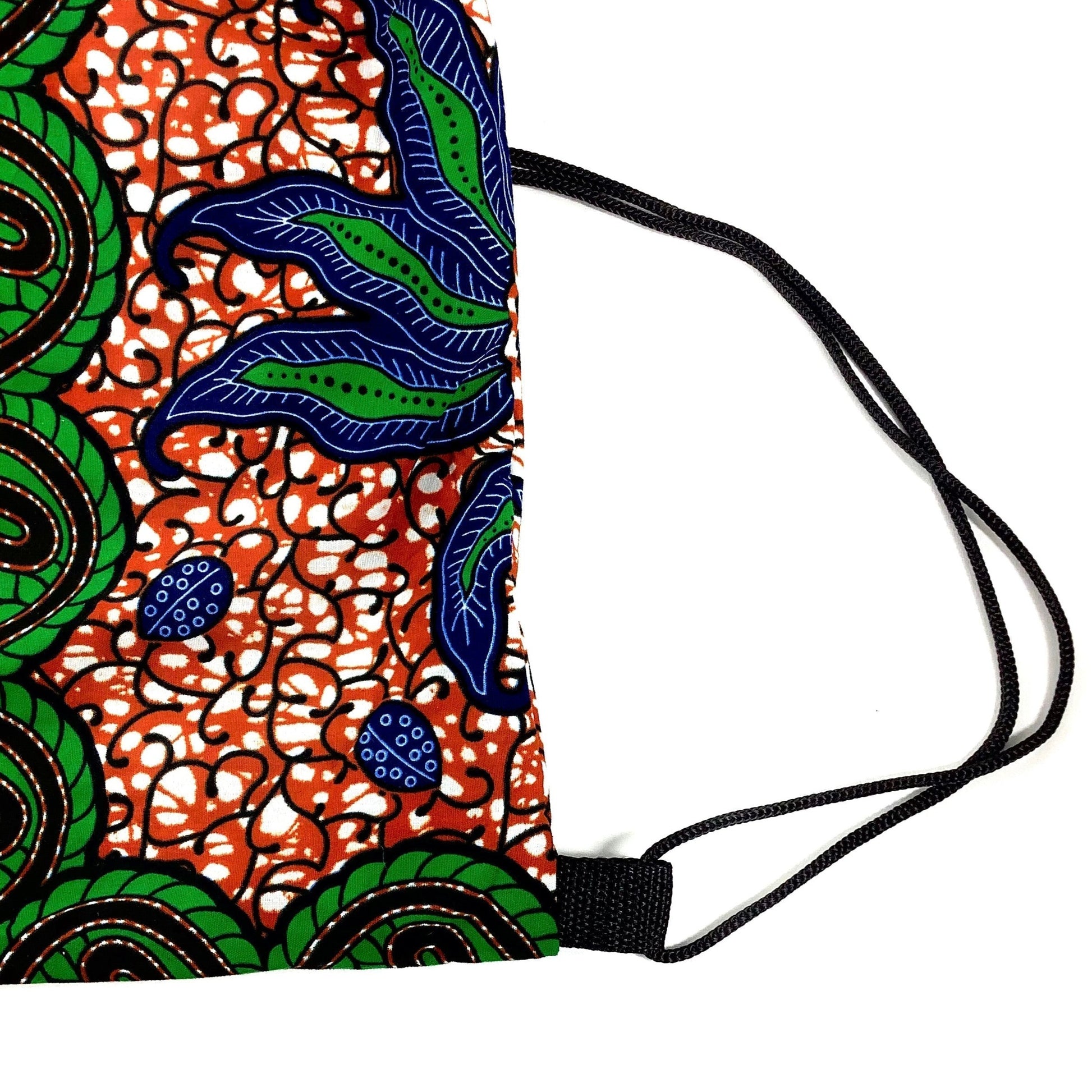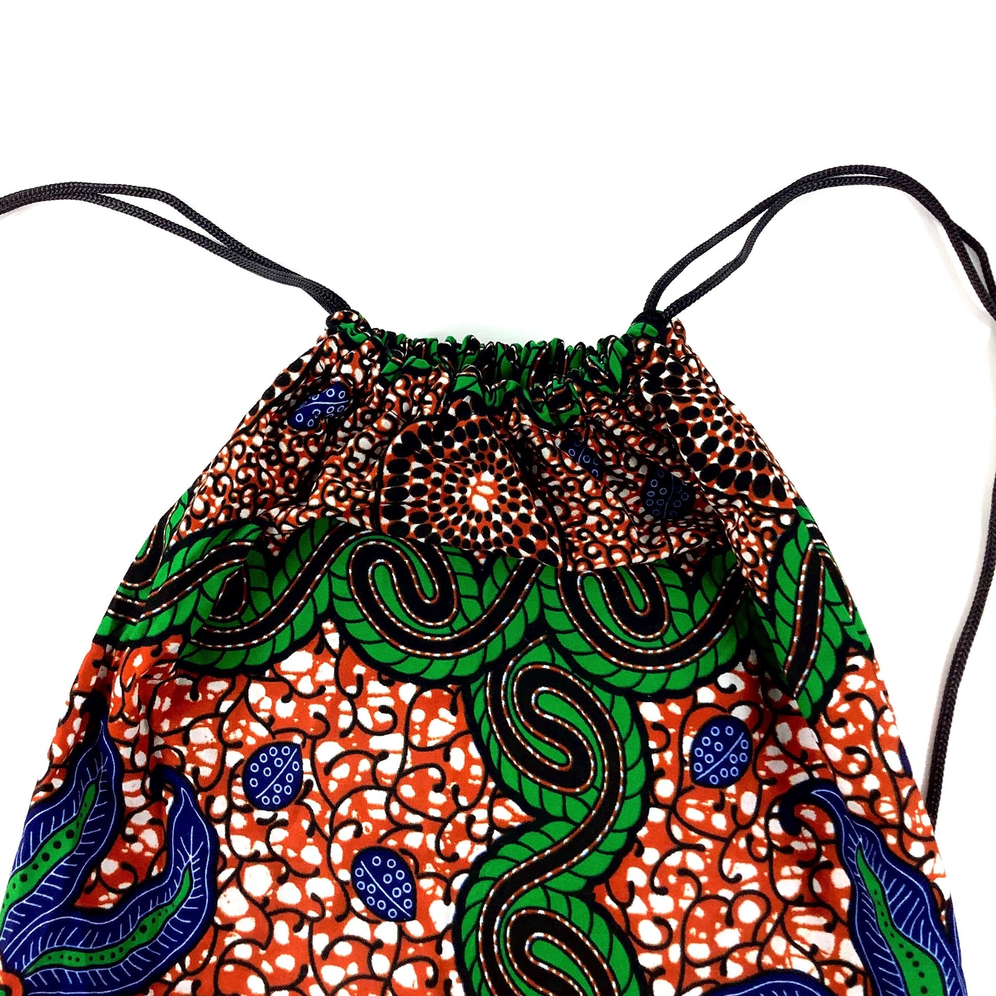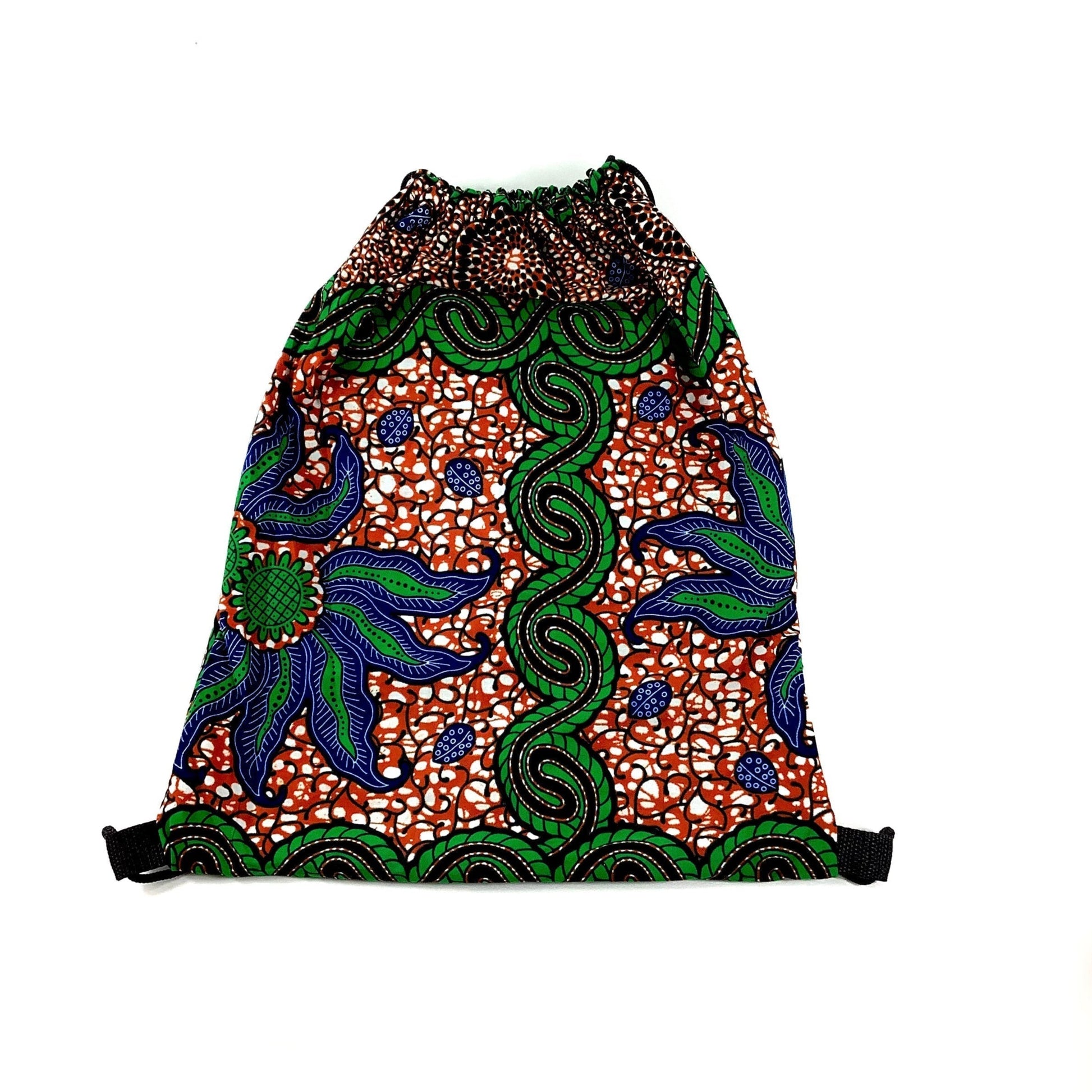 OM: Ryggsäck tillverkad av 100% bomullstyg med vaxtryck från Ghana Textile Printing (GTP). Ryggsäcken har matchande snoddar som axelband. Väskan är fodrad och har ett blixtlåsfack inuti. Perfekt till gympakläder!