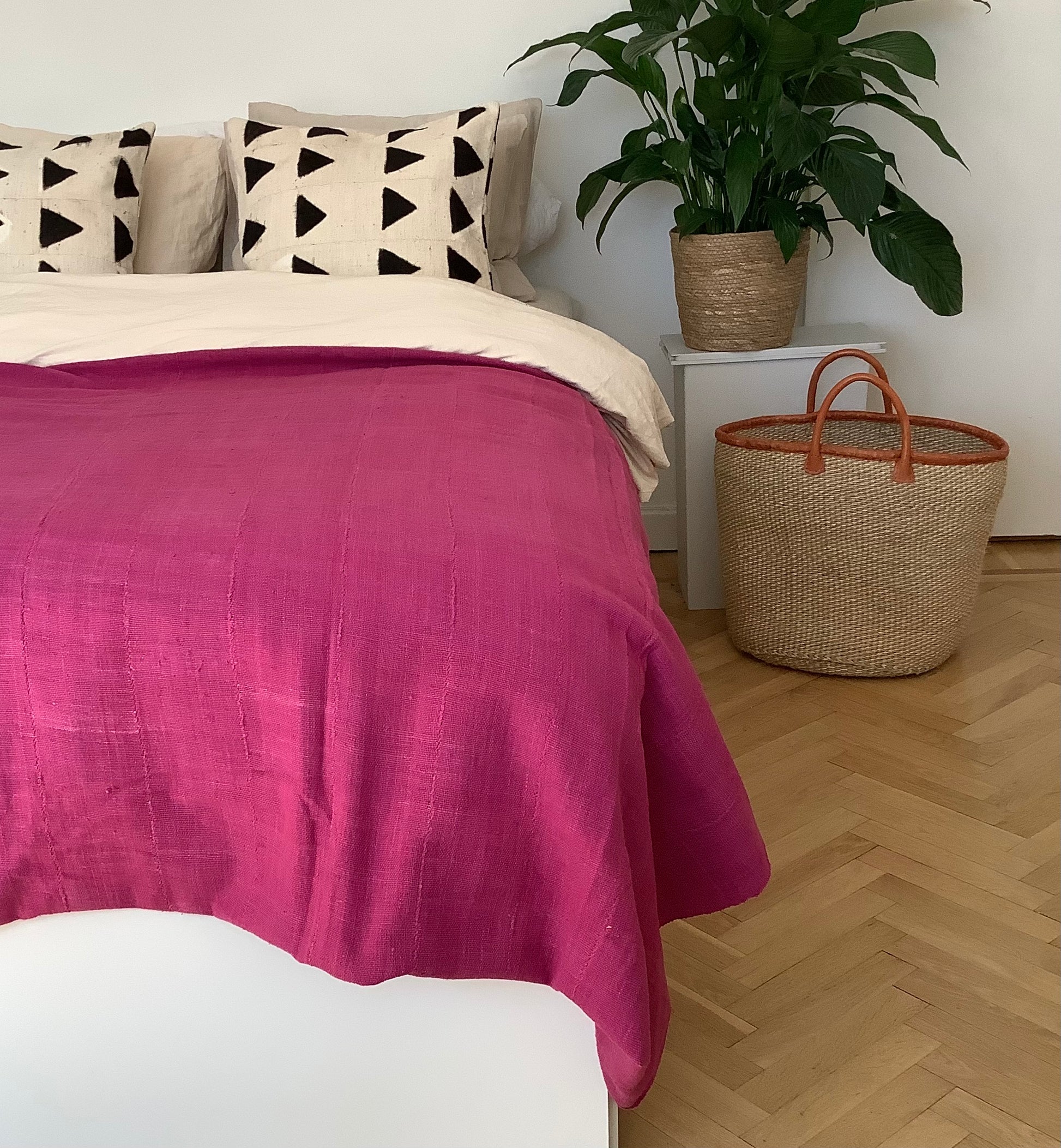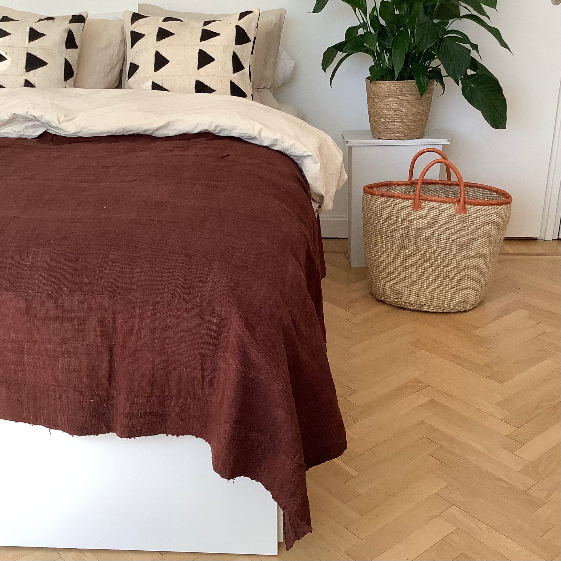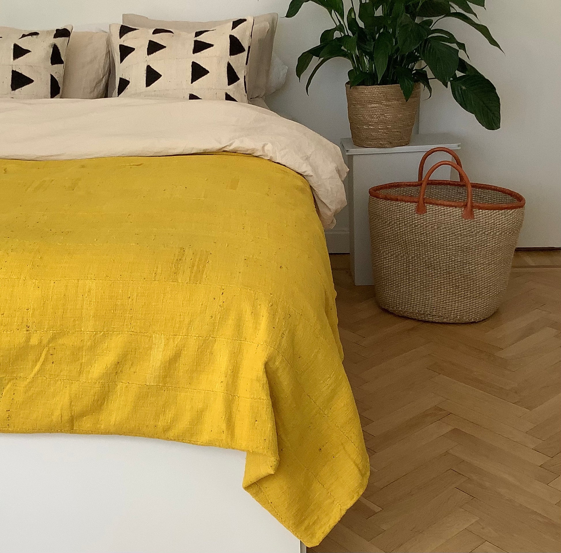 OM: Bògòlanfini, som även kallas Mud Cloth, är en traditionell textil från Burkina-Faso. Tyget tillverkas av ekologisk bomull som odlas lokalt av bönderna och deras familjer. Bomullen skördas och spinns för hand innan den färgas i olika nyanser antingen av naturliga, lokala färgämnen eller gift-fri industriframställd textilfärg. Överkastet är vävt av remsor som sedan sytts ihop.