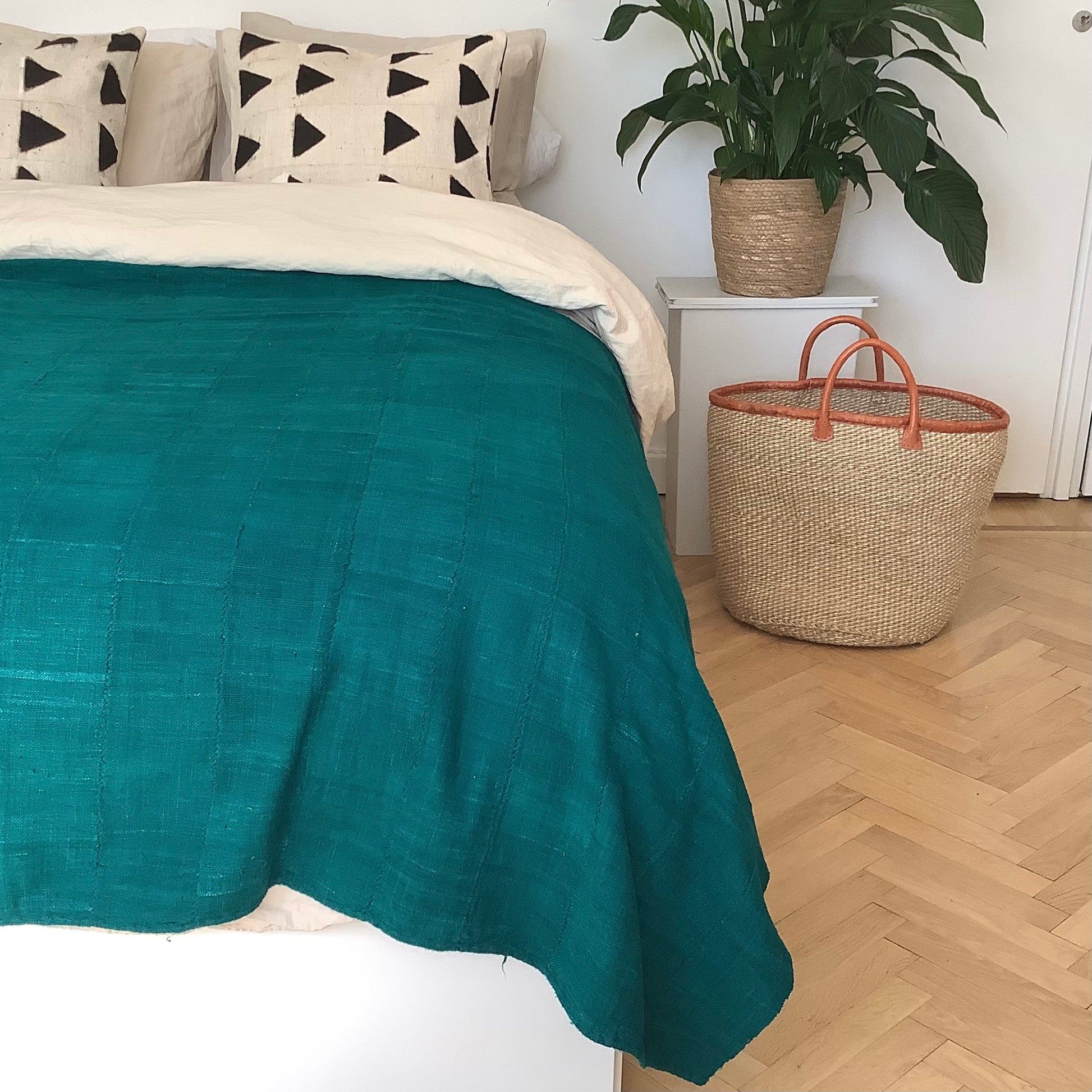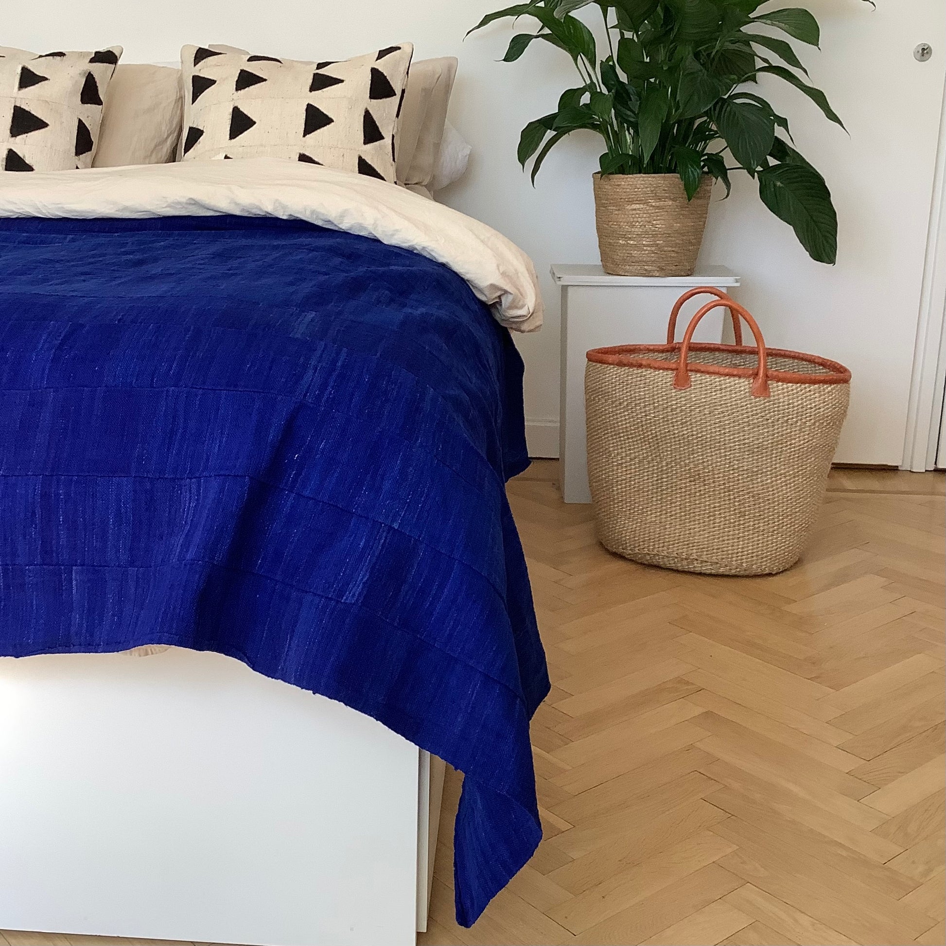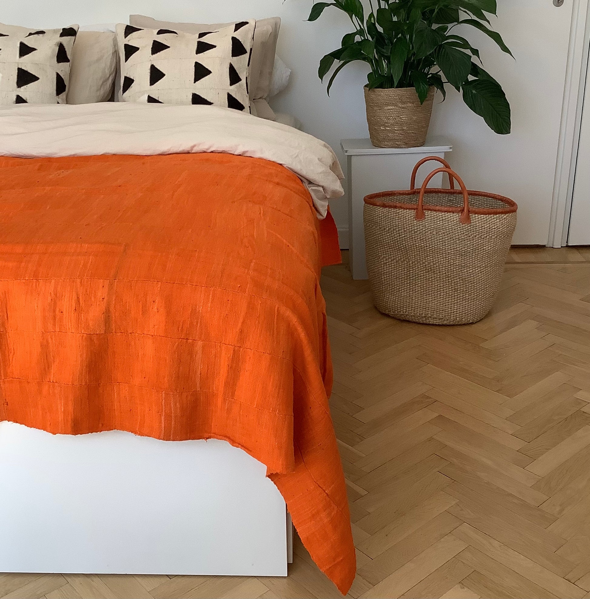 OM: Bògòlanfini, som även kallas Mud Cloth, är en traditionell textil från Burkina-Faso. Tyget tillverkas av ekologisk bomull som odlas lokalt av bönderna och deras familjer. Bomullen skördas och spinns för hand innan den färgas i olika nyanser antingen av naturliga, lokala färgämnen eller gift-fri industriframställd textilfärg. Överkastet är vävt av remsor som sedan sytts ihop.