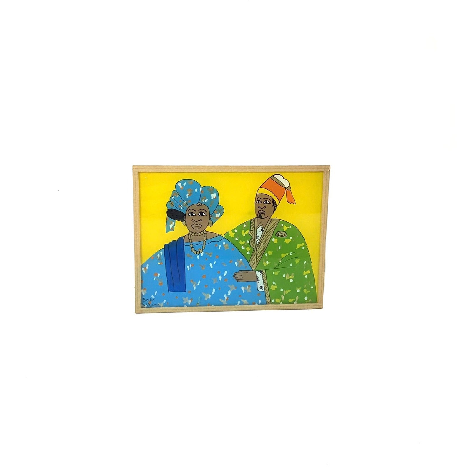 OM: Tavla föreställande en hustru och man. En sådan målning av ett par är vanligt som dekoration i afrikanska hem och symboliserar att huset tillhör ett gift par. Tavlan är målad direkt på glasets baksida i en teknik kallad African reverse glass painting. Alla bilder är unika.