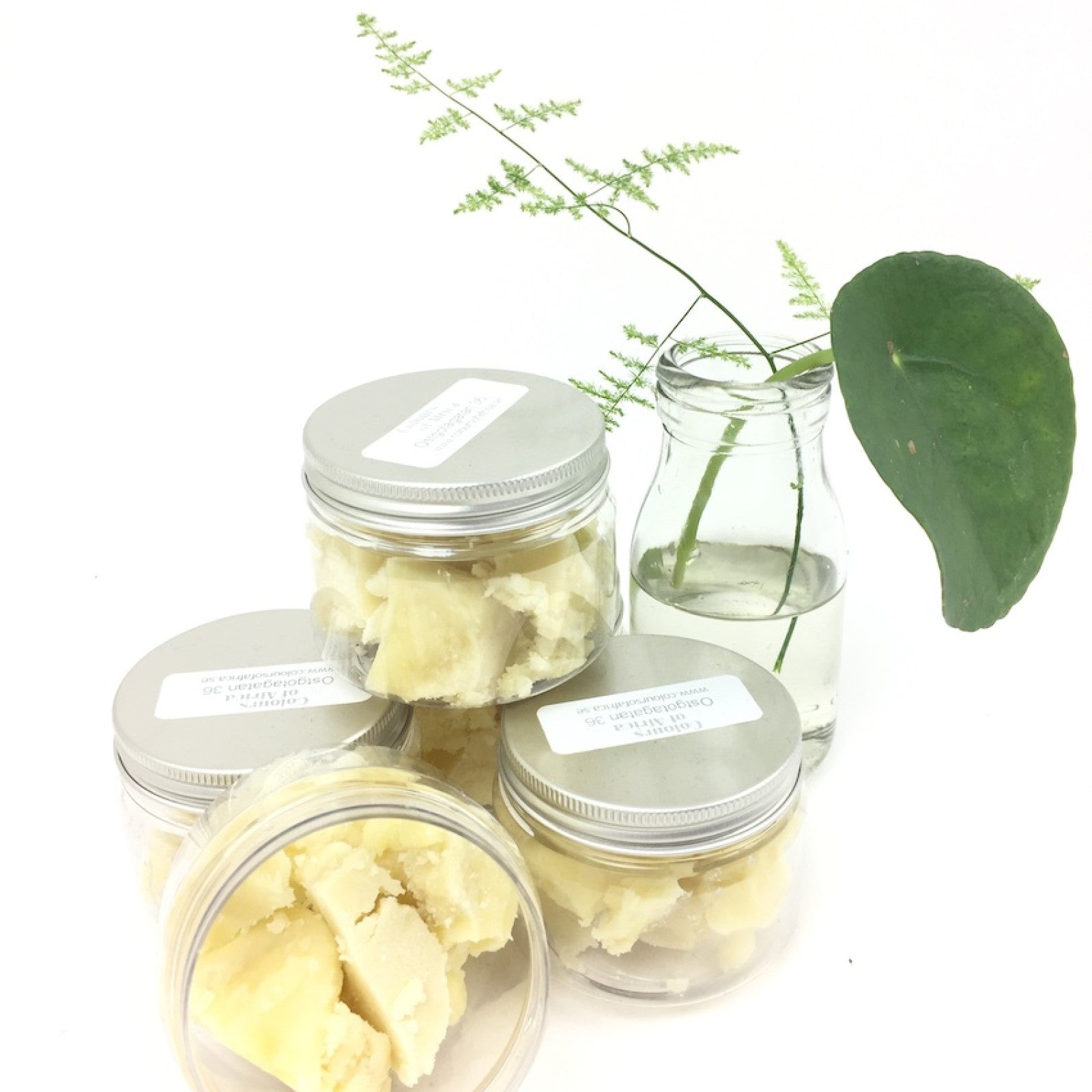 Sheasmör från sheanötsträdet (Vitellaria paradoxa). Trädet är vanligt i Västafrika och dess ätliga frön används även i matlagning. Detta sheasmör tillverkas för hand av kvinnorna i Karibel women's group som hjälper lokala mammor och deras barn att få en bättre utbildning. Sheasmör används som mjukgörande salva, vid torr hud, till massage mm.
