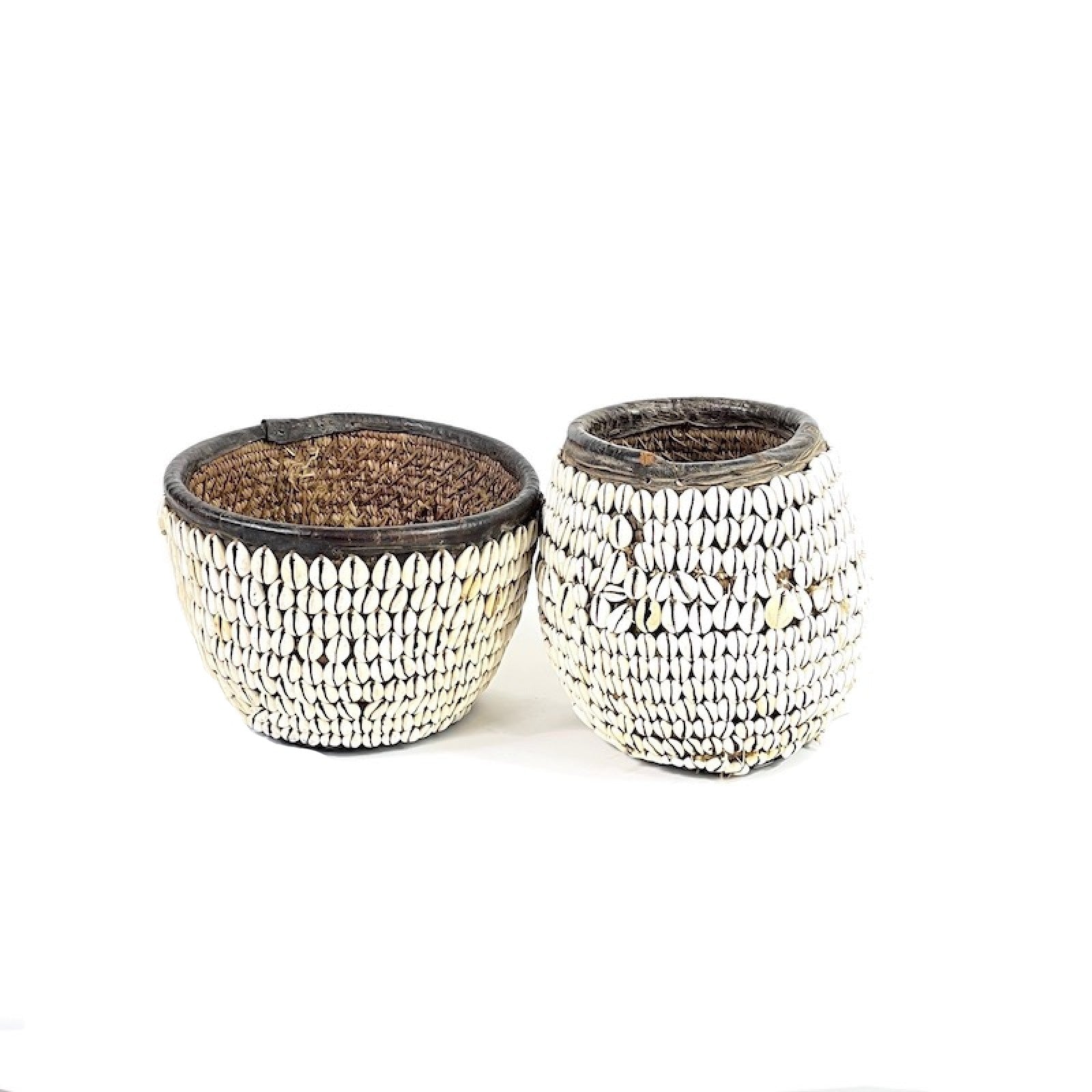 Dessa underbara vintage Nigerianska, housakorgar är prydda med gamla cowrie-skal och läder. Cowrie som betyder hälsa, rikedom och sydd, ges till en hausa ung kvinna under hennes bröllopsceremoni som en prydnadslåda för att lagra hennes finaste smycken. Denna korg är perfekt som konsverk eller som en blomkorg.