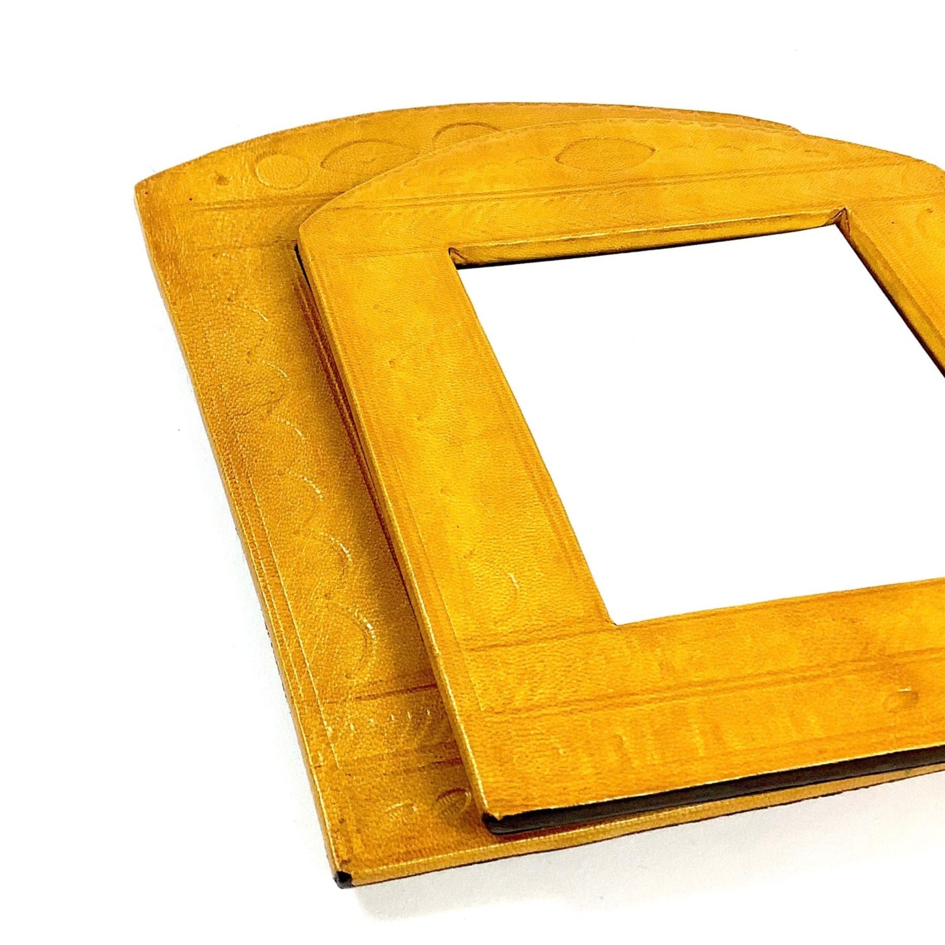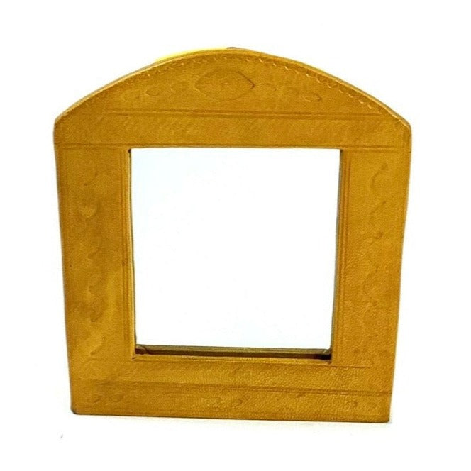 OM: Spegel med ram klädd i Getskinn, handgjord av tuareger i centrala Sahara. Tuaregerna kallas även det blå folket.