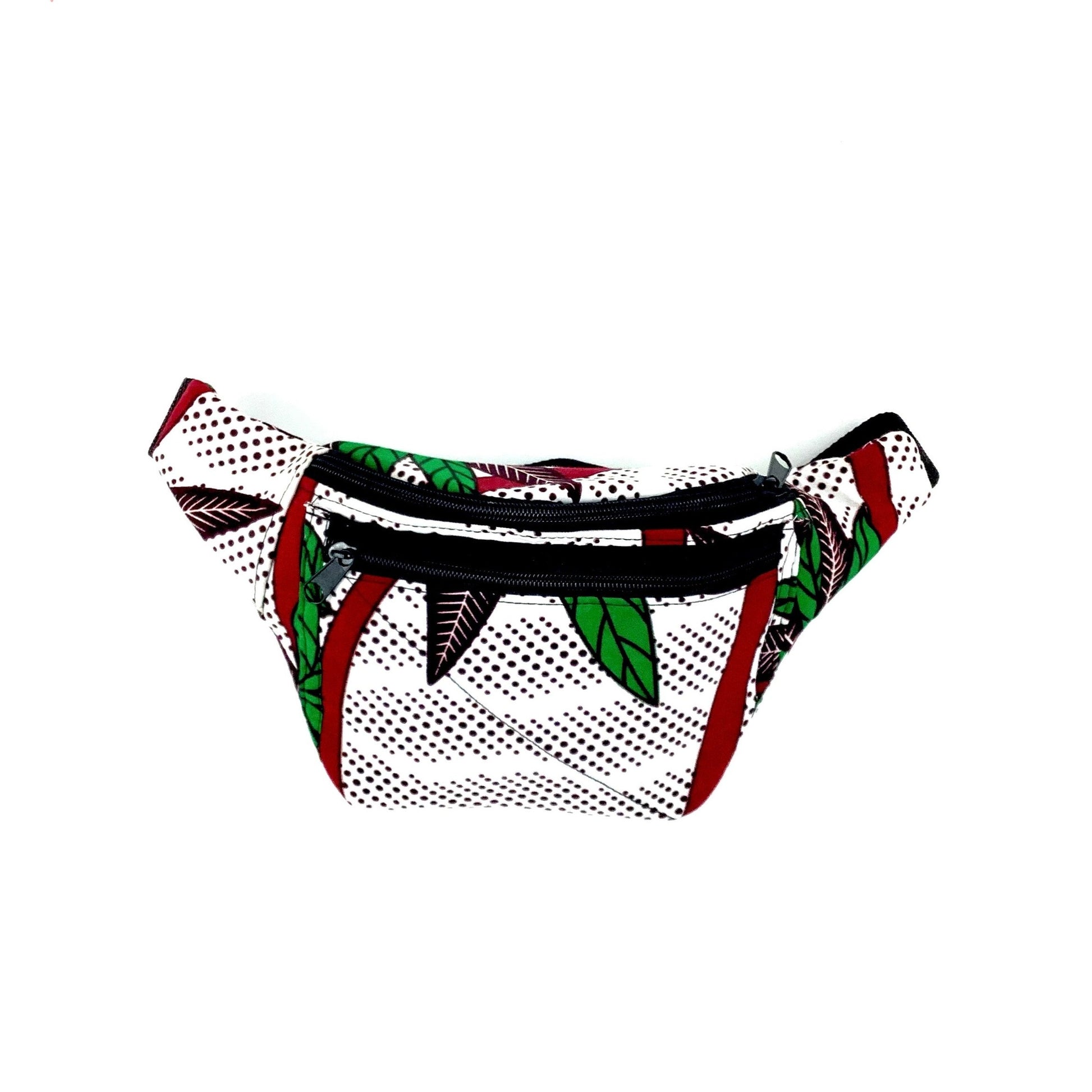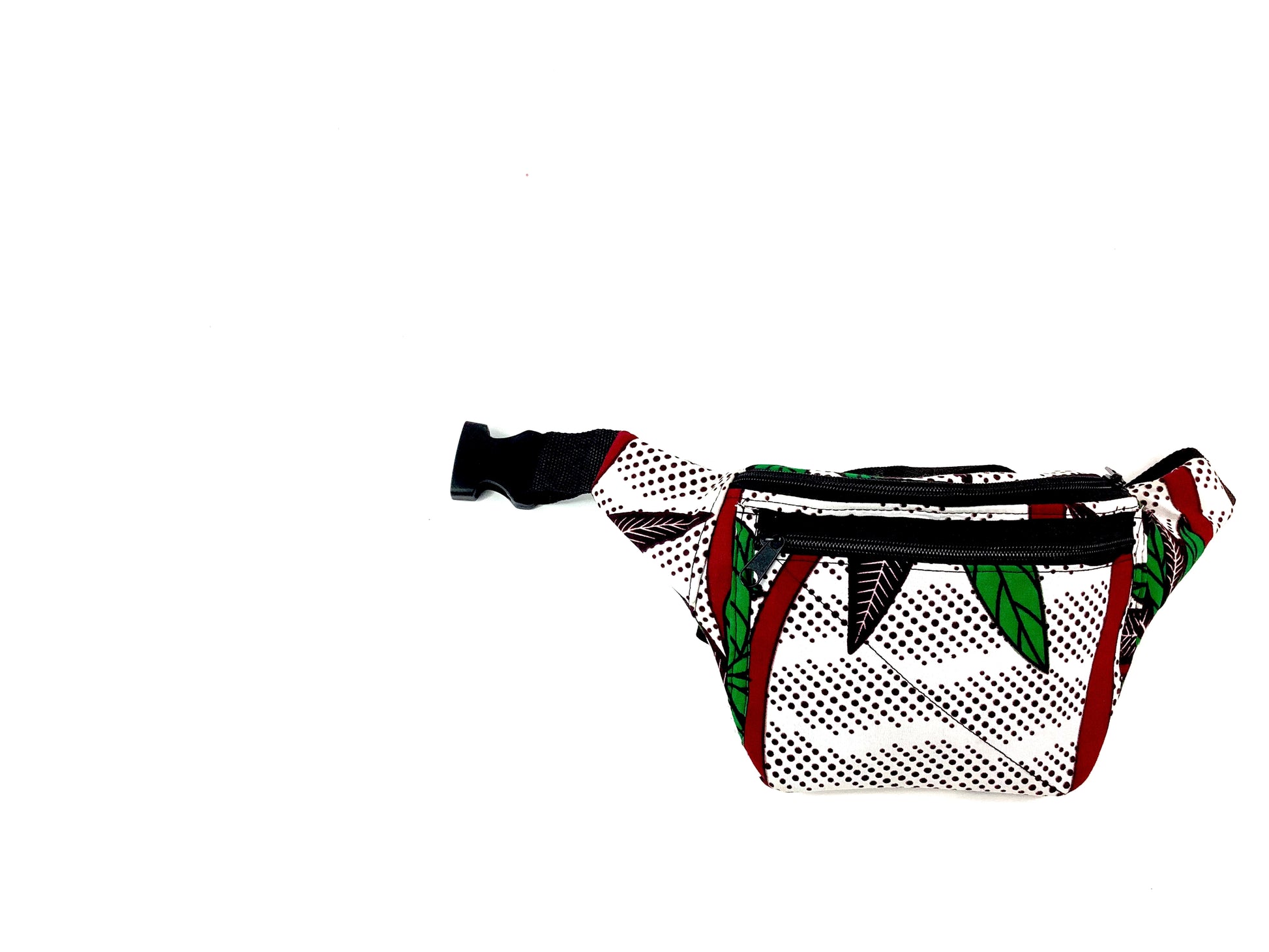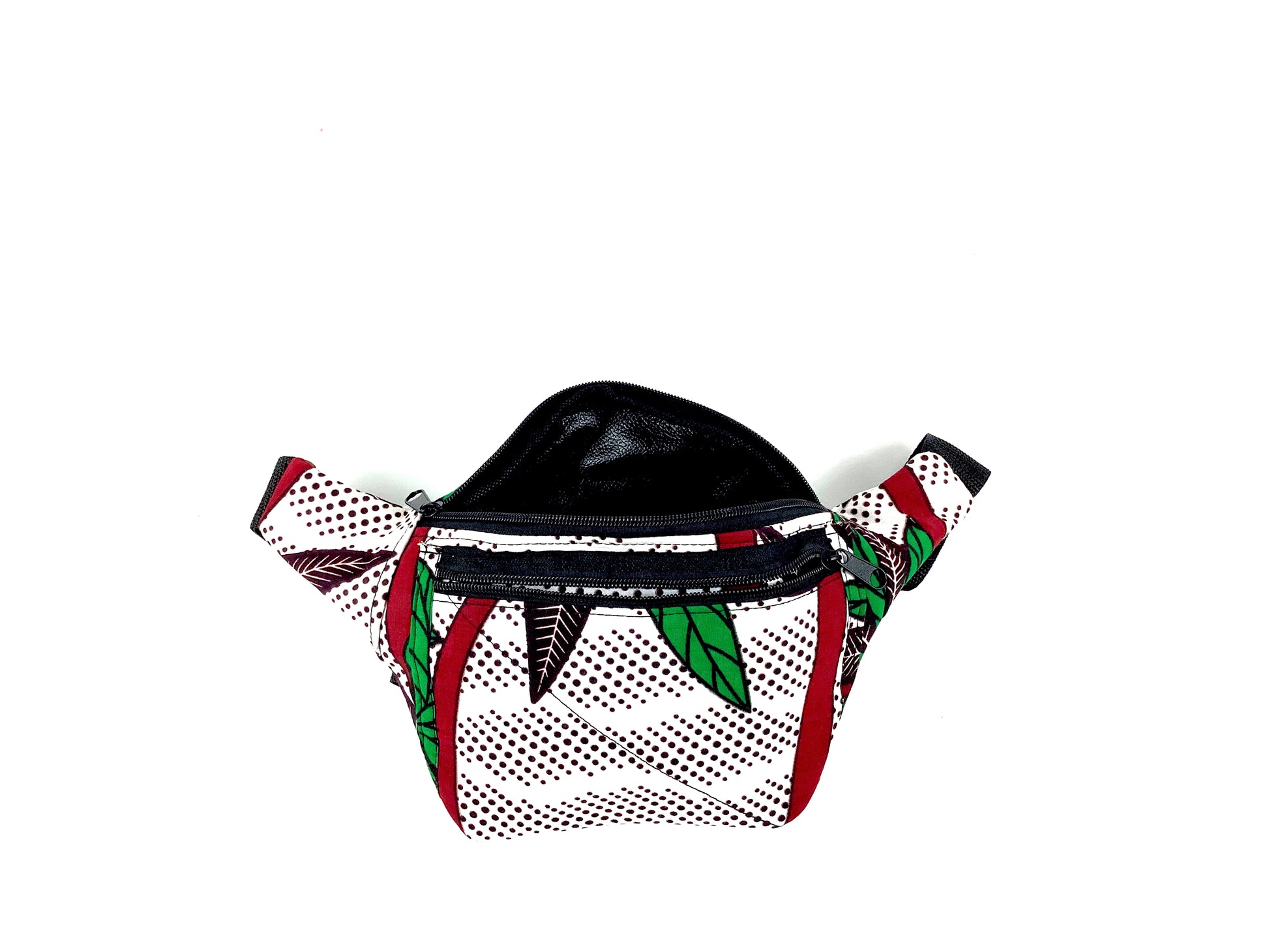 OM: Midjeväska tillverkad av 100% bomullstyg med vaxtryck från Ghana Textile Printing (GTP). Väskan har en lång svart midjerem.